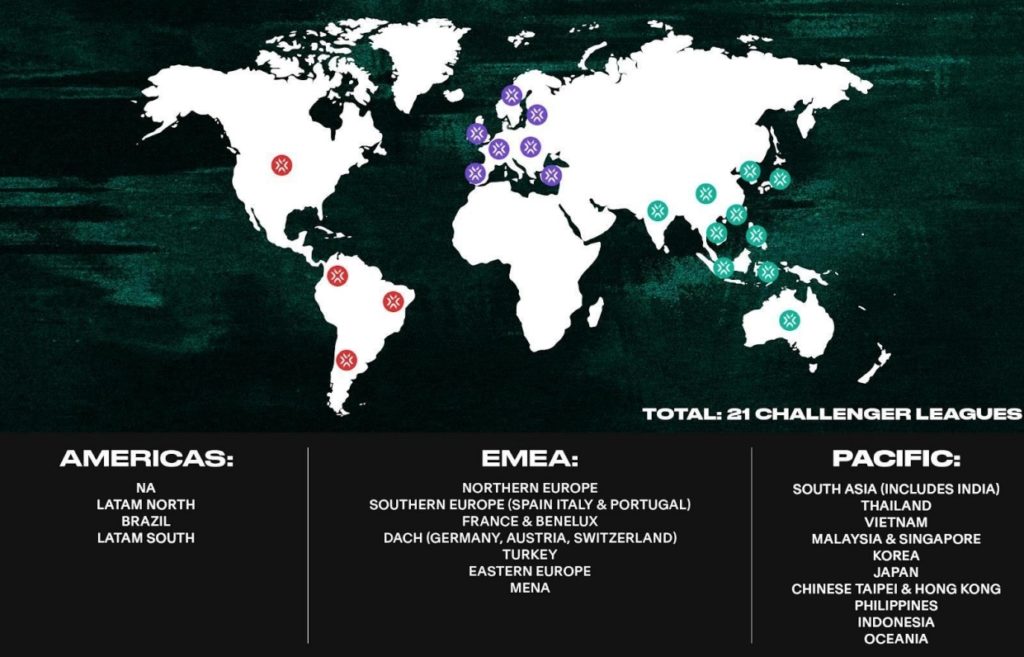 Yirmi bir Challengers ligi dünya çapında gerçekleşecek: dördü Amerika’da, yedisi EMEA’da ve 10’u APAC’de. Ligler aşağıda listelenmiştir: